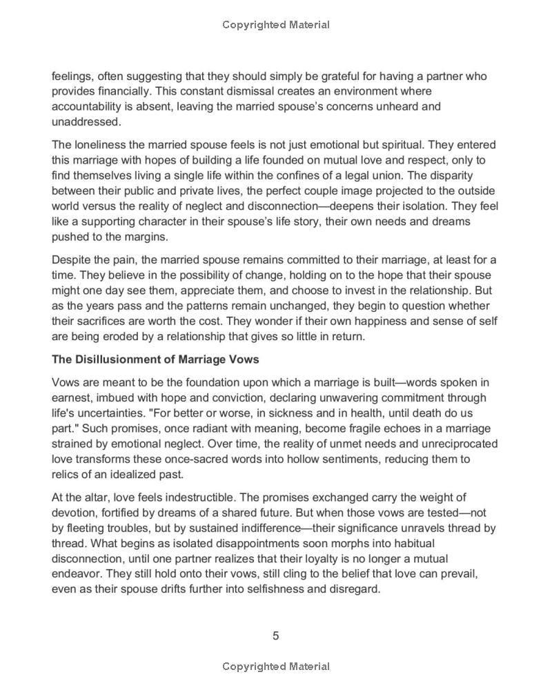 This book is for those silently suffering in a relationship that looks perfect on the outside but feels empty within. Through scriptural insights, relationship strategies, and prayers for restoration, it guides couples from loneliness to renewed love, helping them rediscover God’s plan for marriage.